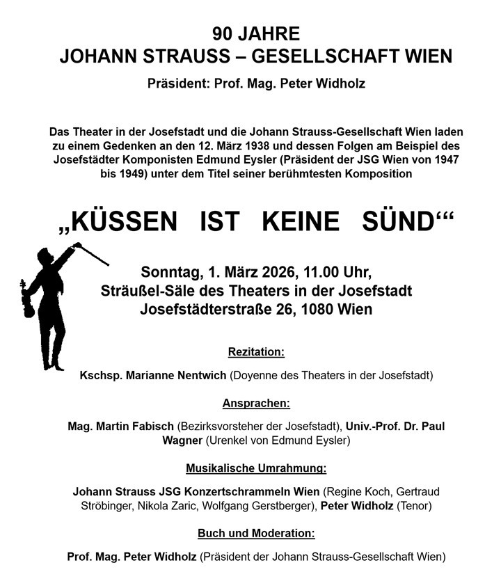 Karten zu € 28,- (für Mitglieder der Johann Strauss-Gesellschaft Wien sowie Wahl- abonnentInnen und InhaberInnen der Mitgliedschaft „Josefstädter Karte“ zu € 23,-) sind ab 4. 2. 2026 an der Kasse des Theaters in der Josefstadt erhältlich.
